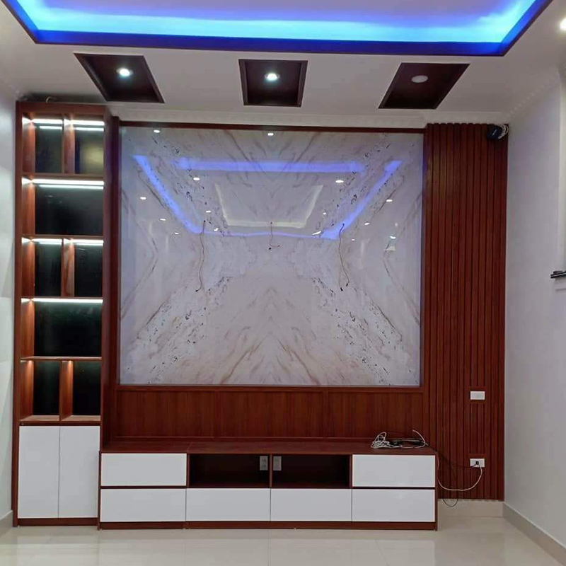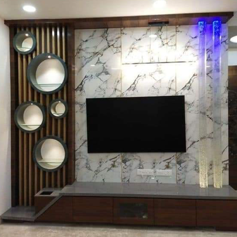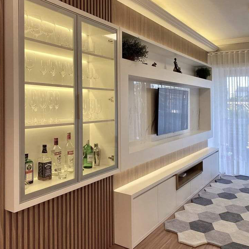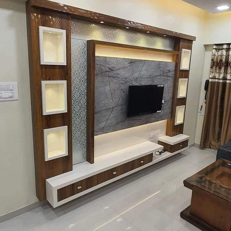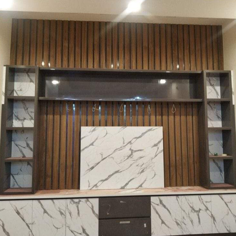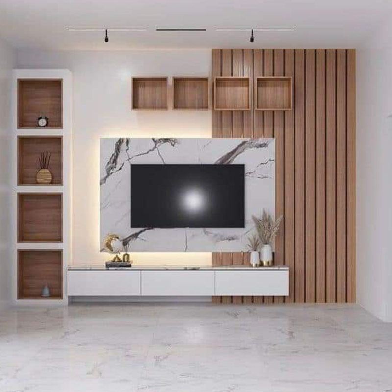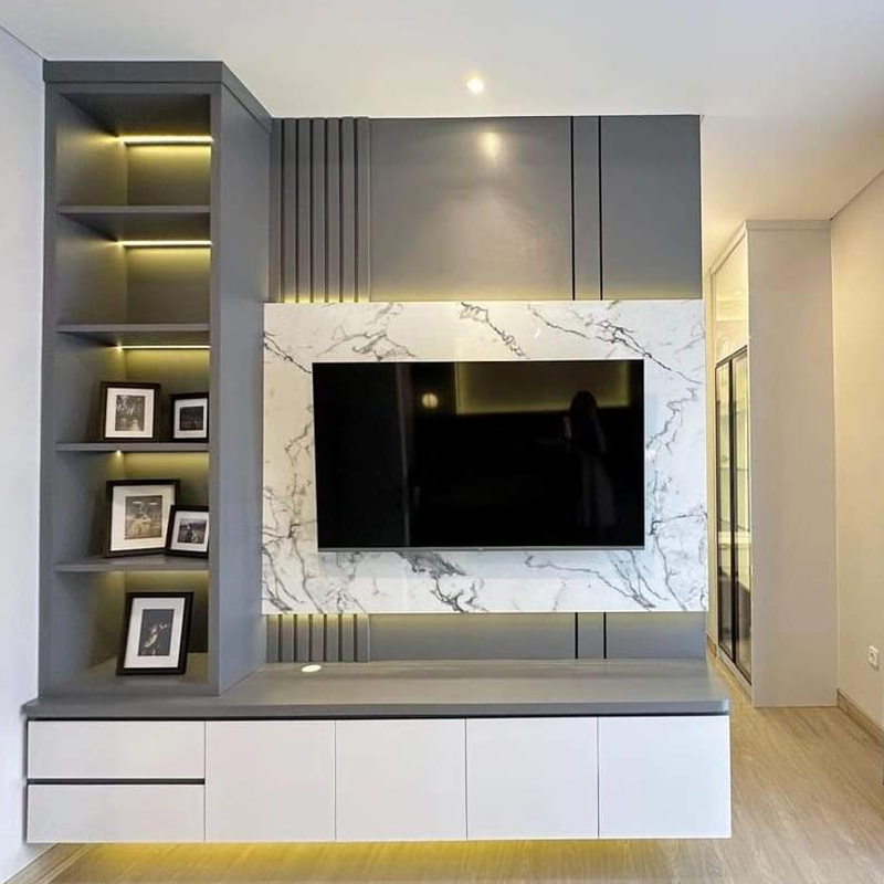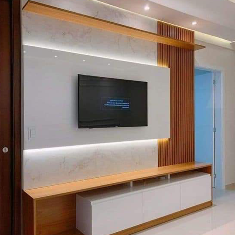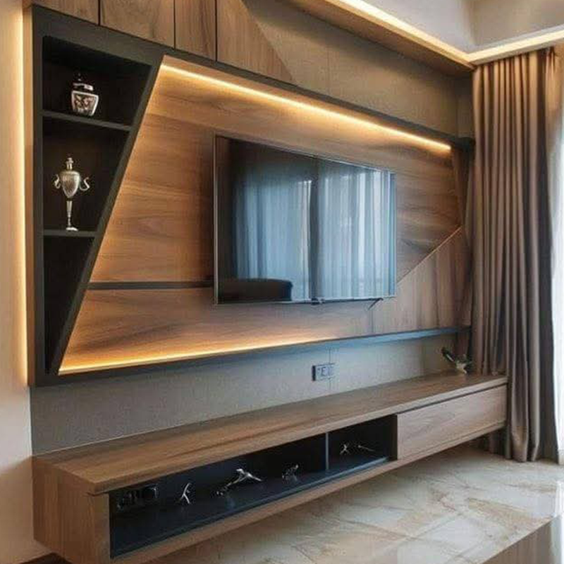 - Desain Modular & Custom Fit: Dirancang mengikuti ukuran dinding dan posisi TV, cocok untuk ruang kecil hingga area keluarga luas.